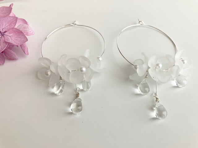 ネモフィラ(スノーストーム)とチェコビーズのフープピアス