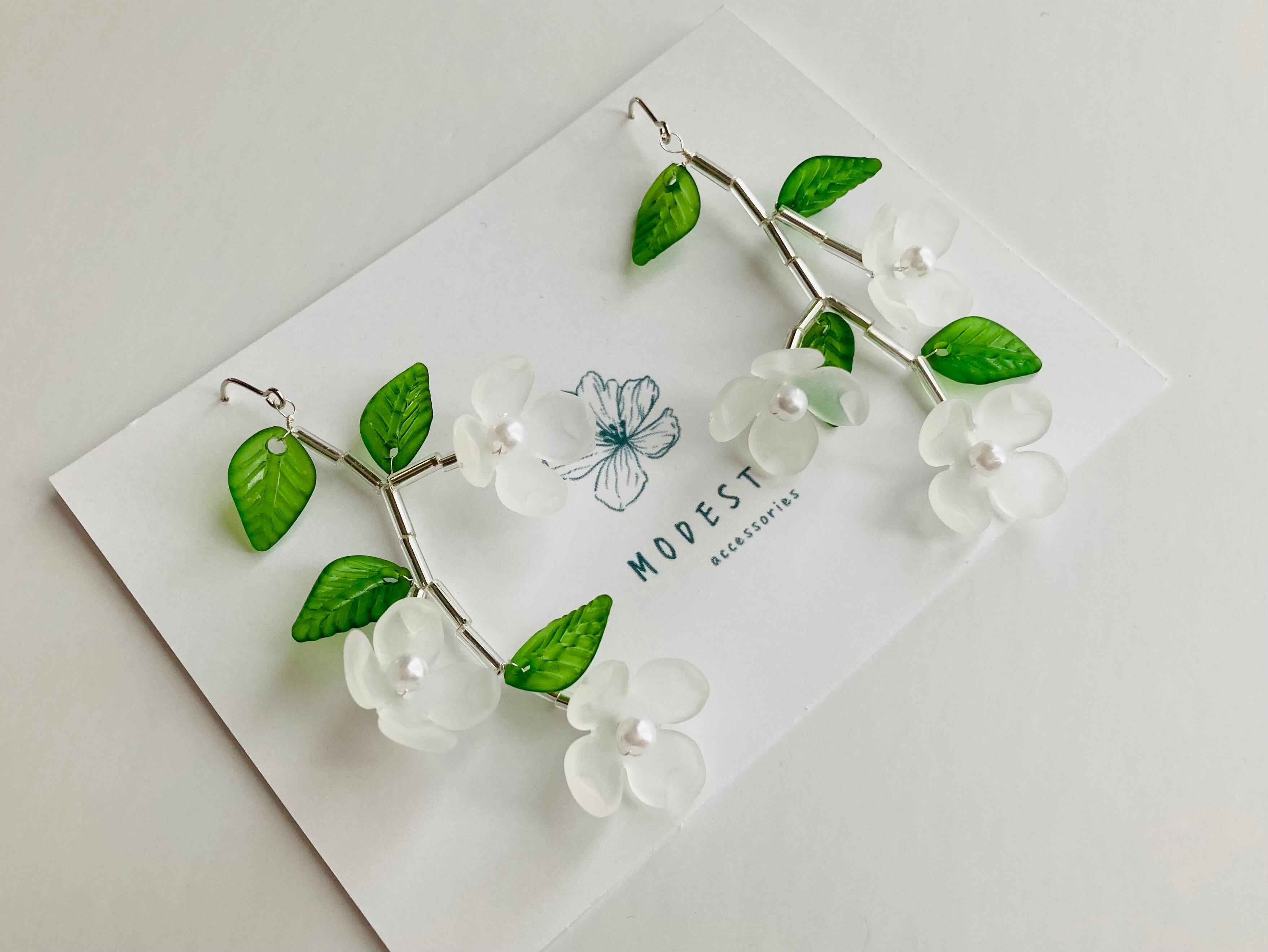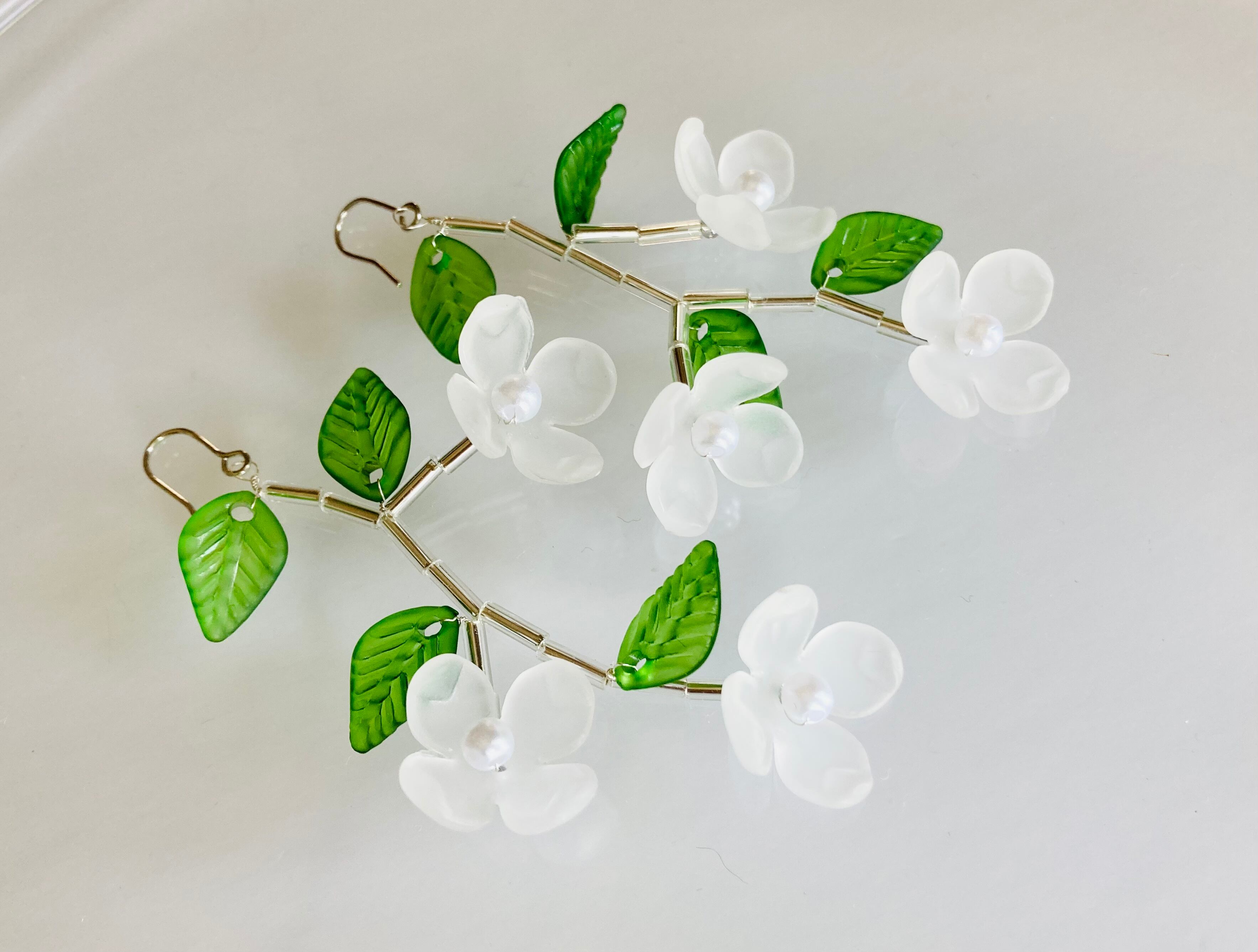 花の真ん中はパールを使用し、枝の部分はシルバーのビーズを使用しています。
