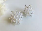 パールとシルバービーズをシャワー台に編み込み作成しました。
