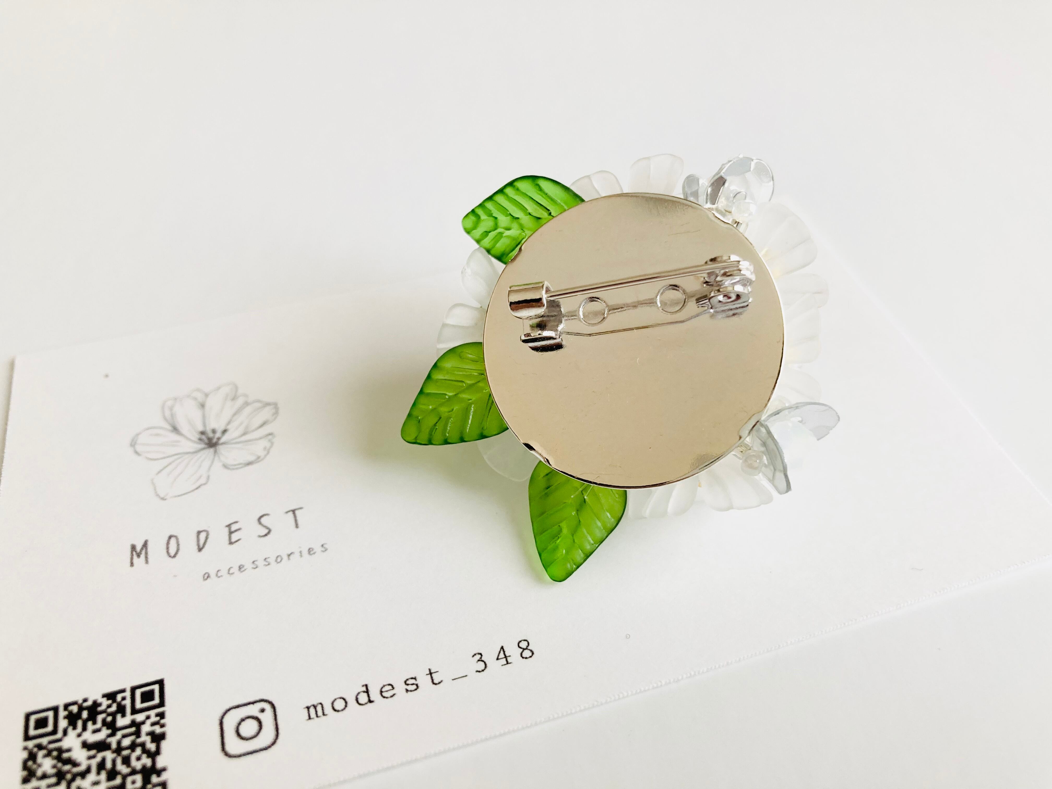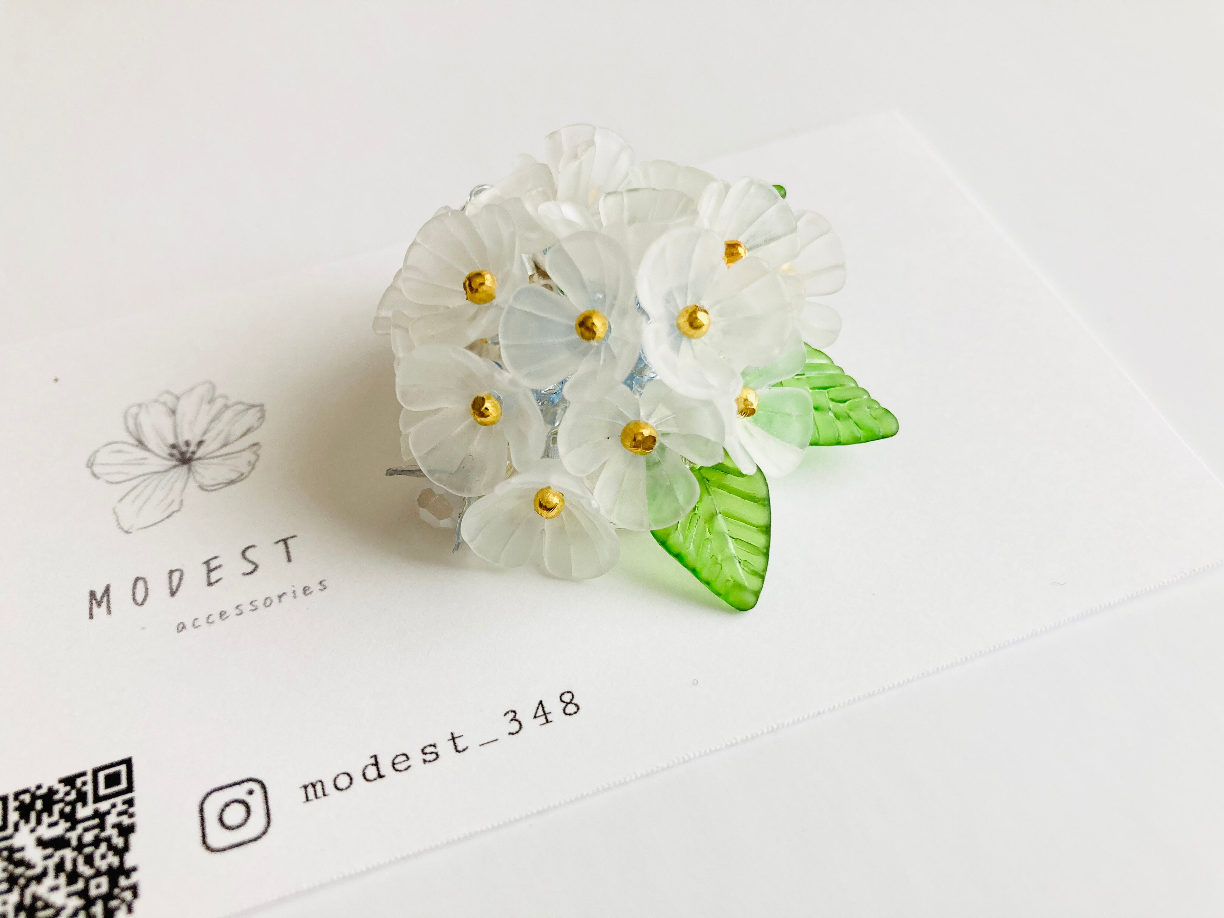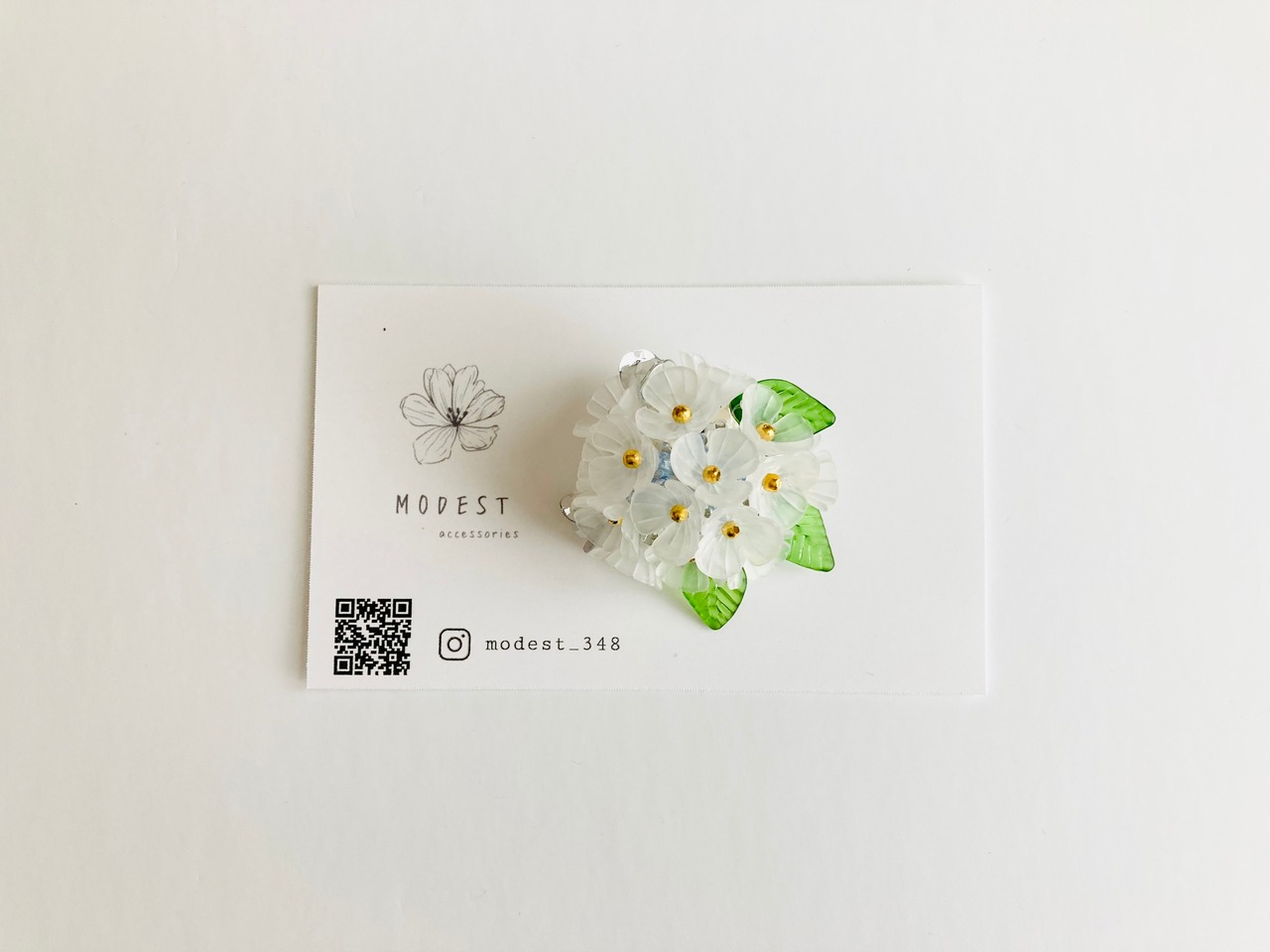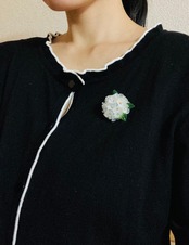 集まった小花の周りに、スパンコールのブーケと緑葉でブーケに仕上げています。