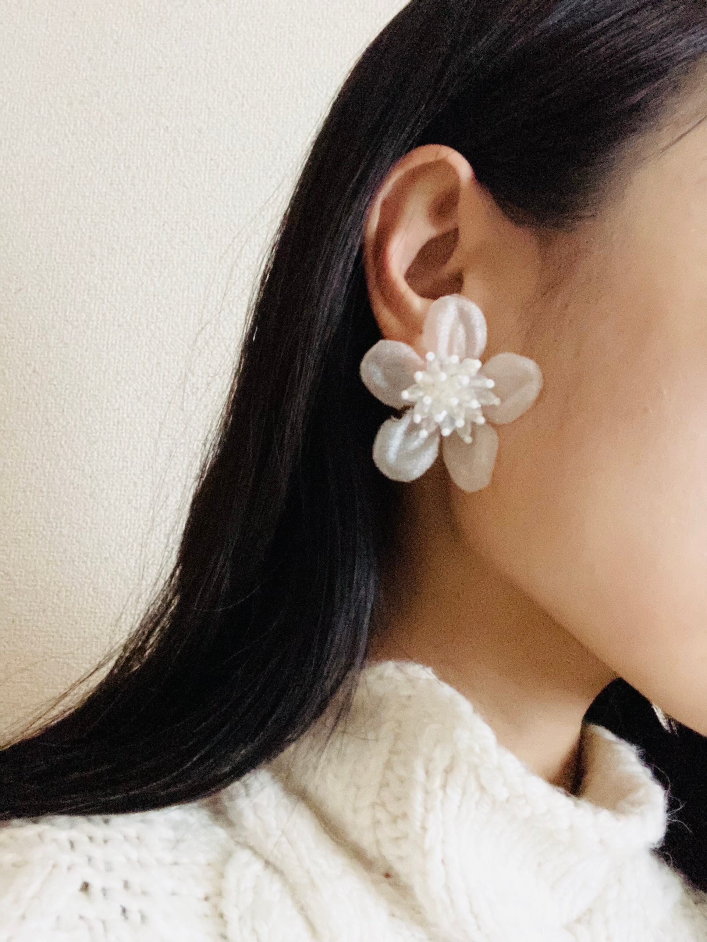 オーガンジーフラワーとつぶつぶの大ぶりピアス